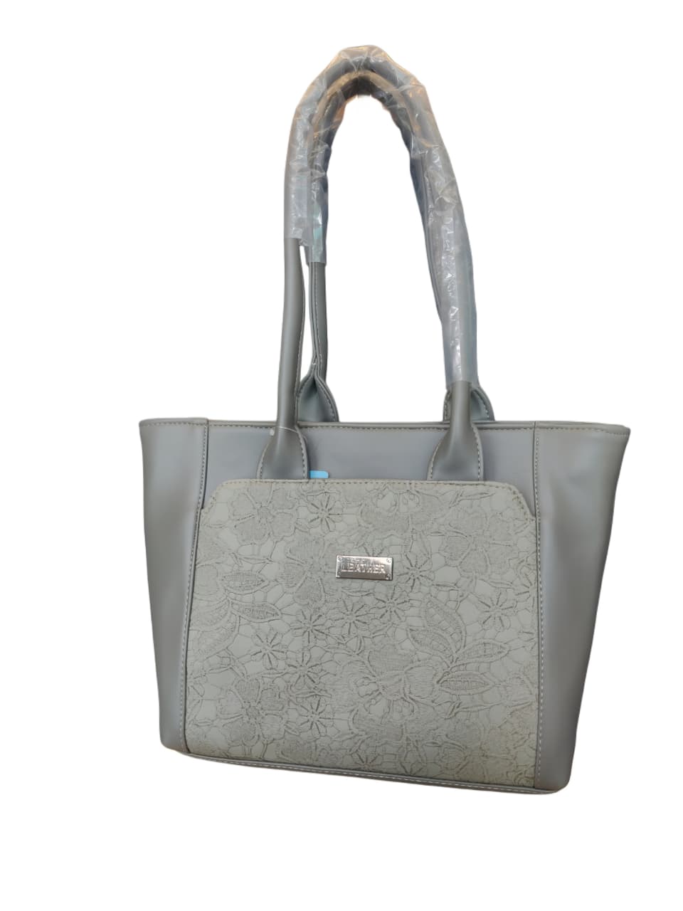 Add a touch of feminine elegance to your ensemble with this stylish and versatile tote bag. Crafted from high-quality faux leather, this bag stands out with its unique design: a sleek, smooth dove grey body beautifully contrasted by a sophisticated front panel featuring an intricate tone-on-tone floral embossed pattern. This delicate detailing adds a charming texture and visual interest, making the bag truly distinctive.