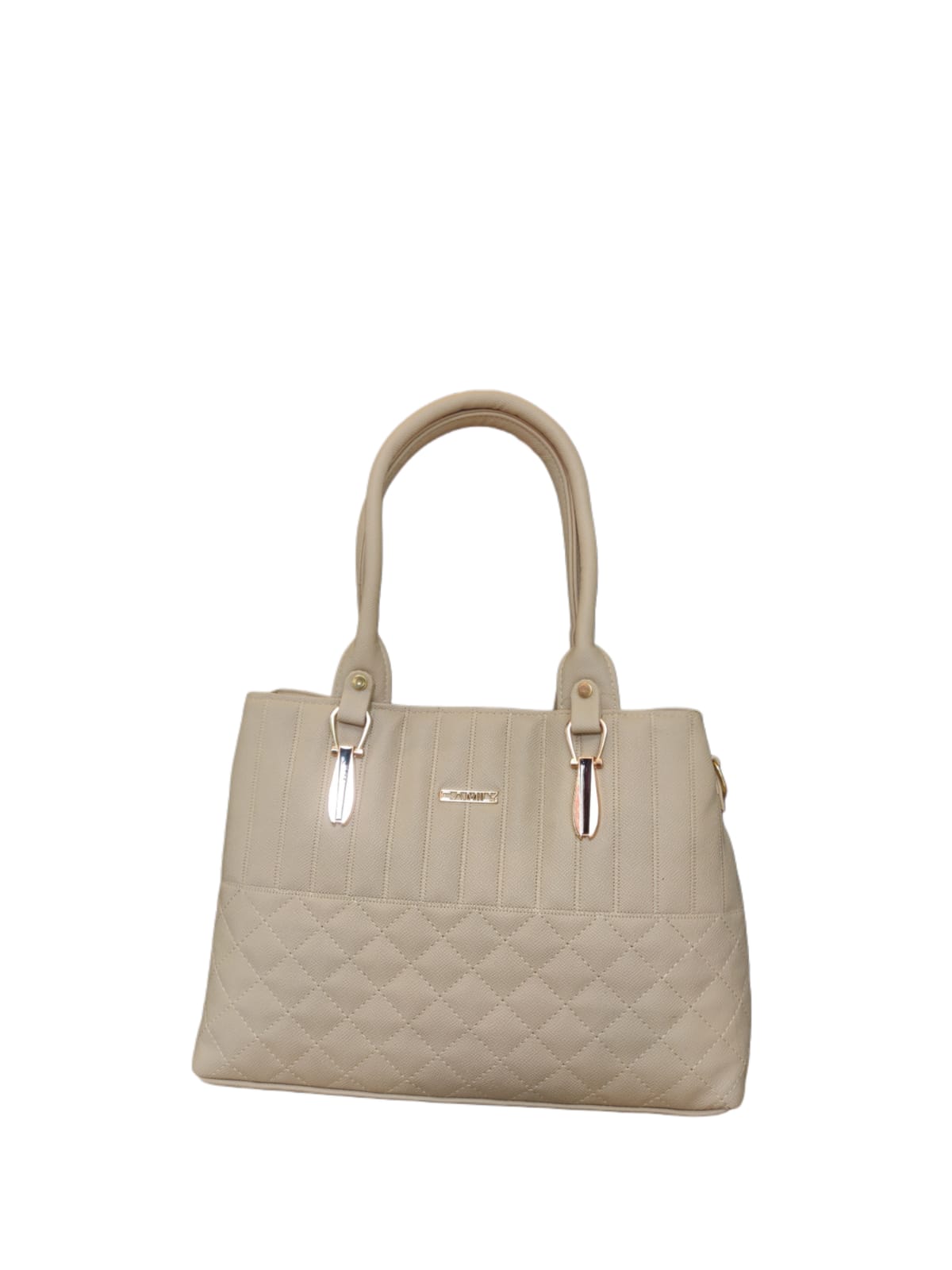 Elevate your accessory collection with this chic cream-colored handbag. It boasts a beautifully quilted lower panel, smooth upper, and polished gold-tone hardware, including stylish handle attachments and a subtle brand plaque. This structured bag offers ample space, combining timeless elegance with practical design for everyday sophistication.