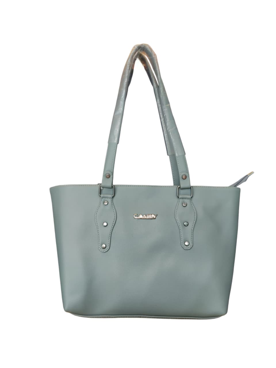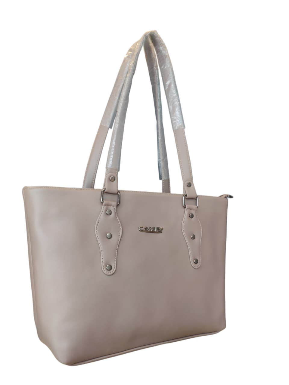 The front of the bag features a clean design, subtly accented by silver-tone hardware including stylish rivets and strap connectors. A prominent metallic “CAMIX” brand logo is centrally placed, affirming its quality and chic appeal. The comfortable shoulder straps, appearing to be wrapped for protection, are designed for easy and comfortable carrying throughout your busy day.