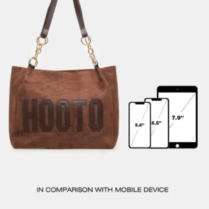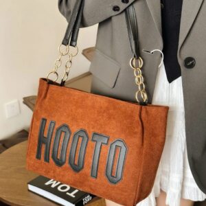 Description: A stylish and durable canvas tote bag featuring large brown appliqué “HOOTO” text across the lower front. The bag is equipped with long, brown faux leather shoulder straps connected by distinctive gold-tone rings and chain links.