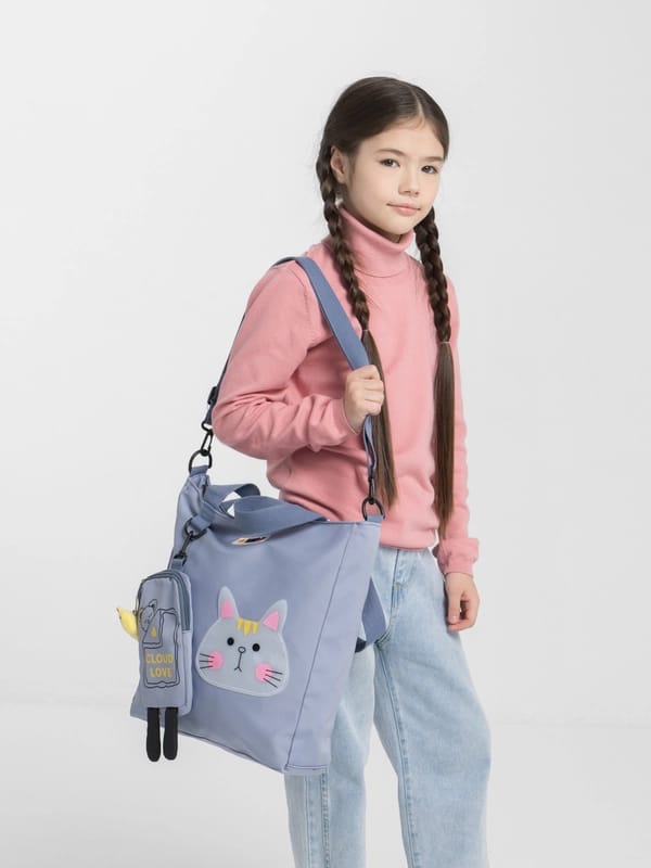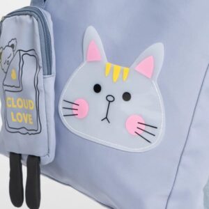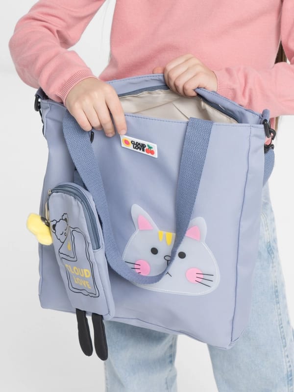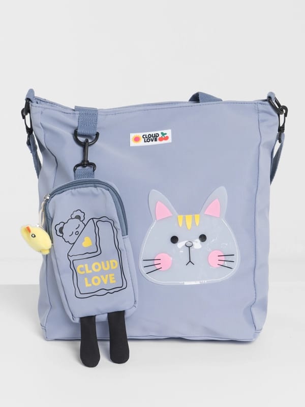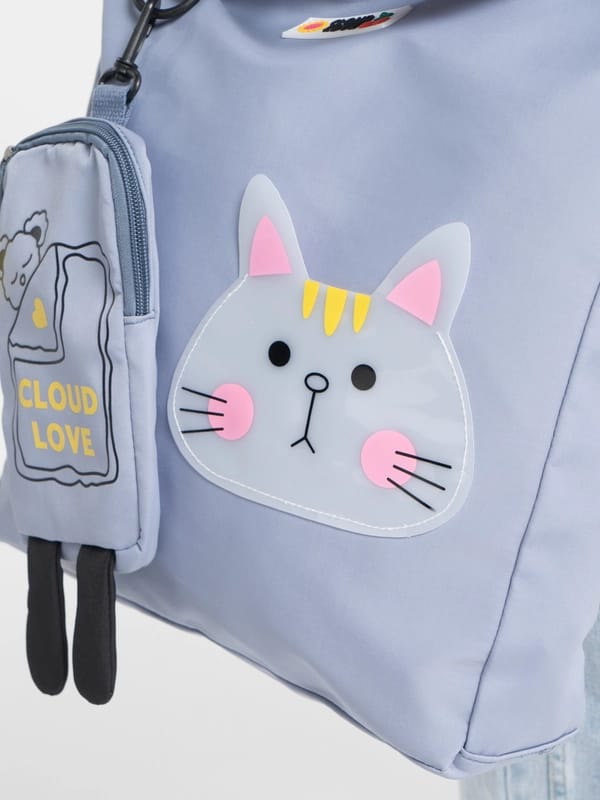 Playful Cat-Face Casual Tote Bag with ‘Cloud Love’ Pouch – Sky Blue