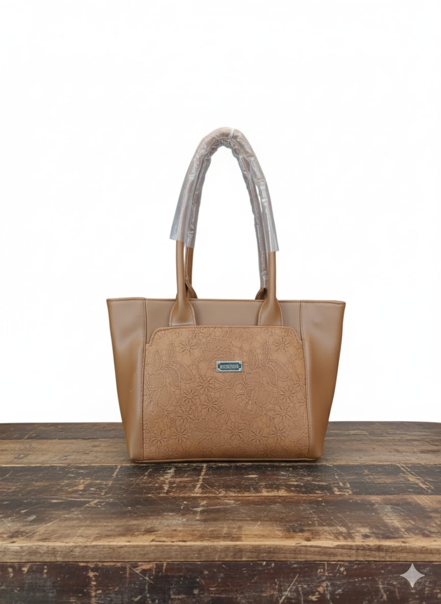 Embrace classic charm with a contemporary twist with this elegant and practical tote bag. Crafted from high-quality faux leather, this bag features a captivating design: a smooth, warm caramel tan body beautifully accented by a distinctive front panel showcasing an intricate tone-on-tone floral embossed pattern. This delicate yet eye-catching detail adds textural interest and a touch of refined femininity to the bag’s overall aesthetic.