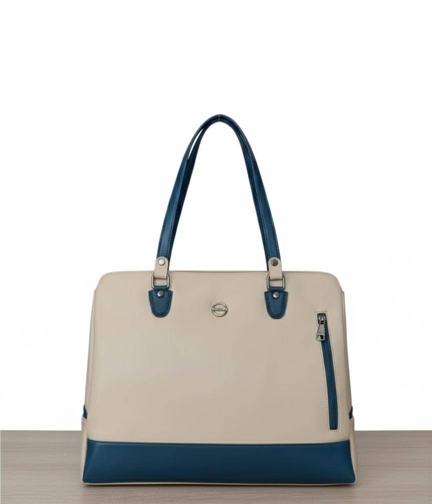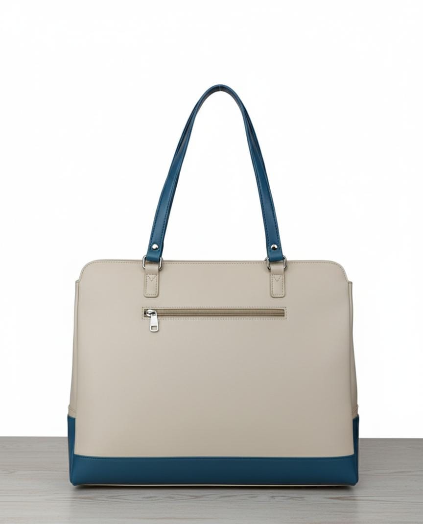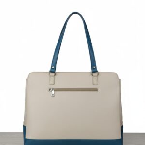 This cream and teal tote is an ideal accessory for those who appreciate contemporary design and wish to add a sophisticated splash of color to their professional or casual attire.