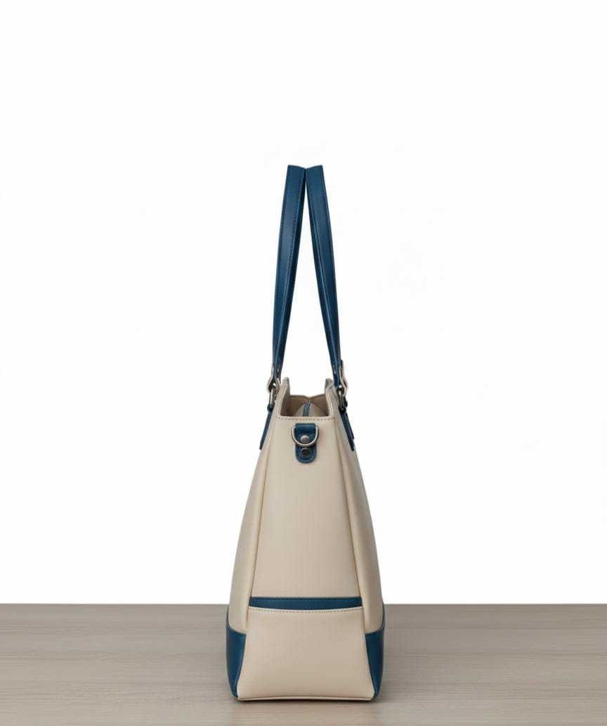 Striking Two-Tone Faux Leather Tote Bag – Cream & Teal Sophistication