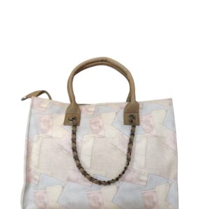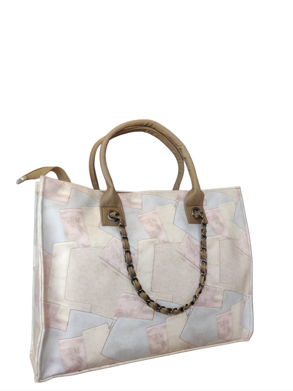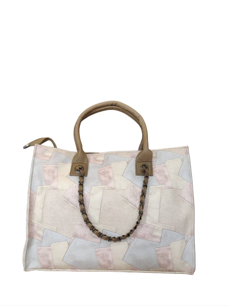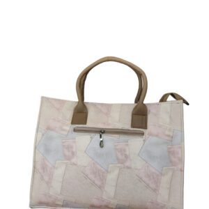 Soft Geometric Design: The bag’s body showcases a tasteful patchwork of geometric shapes in muted, gentle tones of pale pink, light blue, and cream/beige. This subtle yet stylish design offers a modern aesthetic that complements any wardrobe.
